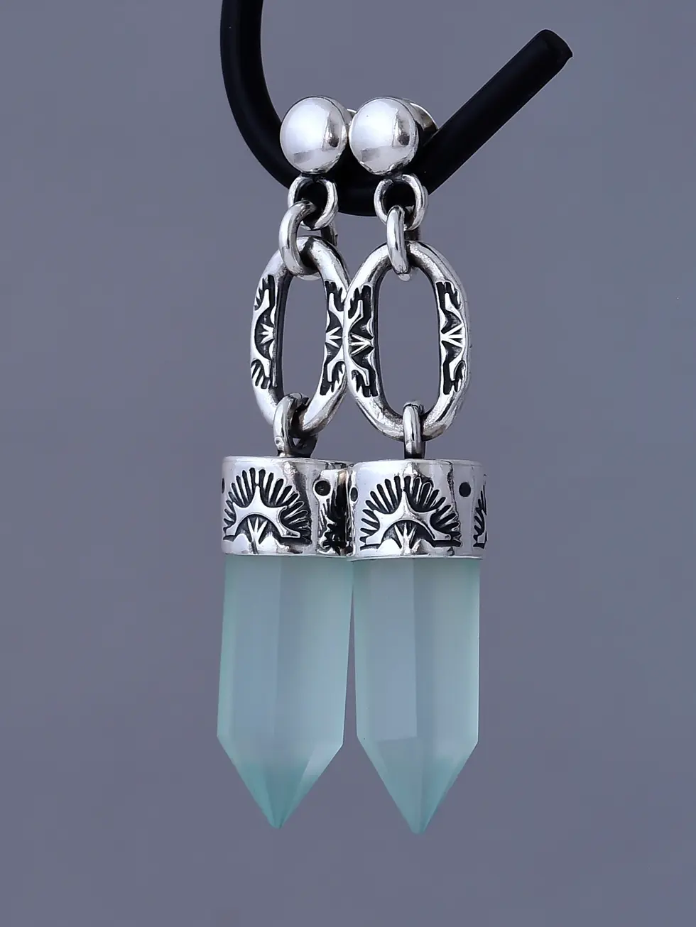 These earrings feature mint chalcedony points set in fine silver bezels with hand-stamped and oxidized details. The chunky design, together with the soft mint tone and darkened silver, creates a bold and moody look.
