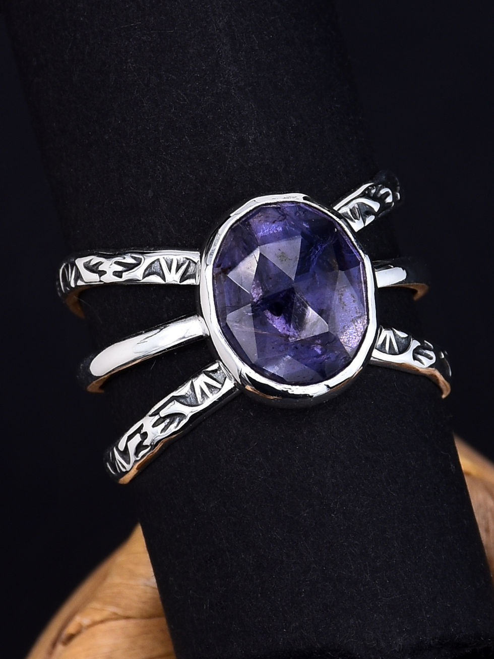 This handmade sterling silver ring features a purple iolite set in a plain bezel. The split triple half-round band forms subtle X-shapes at the front and back, accented with hand-stamped patterns for added character.