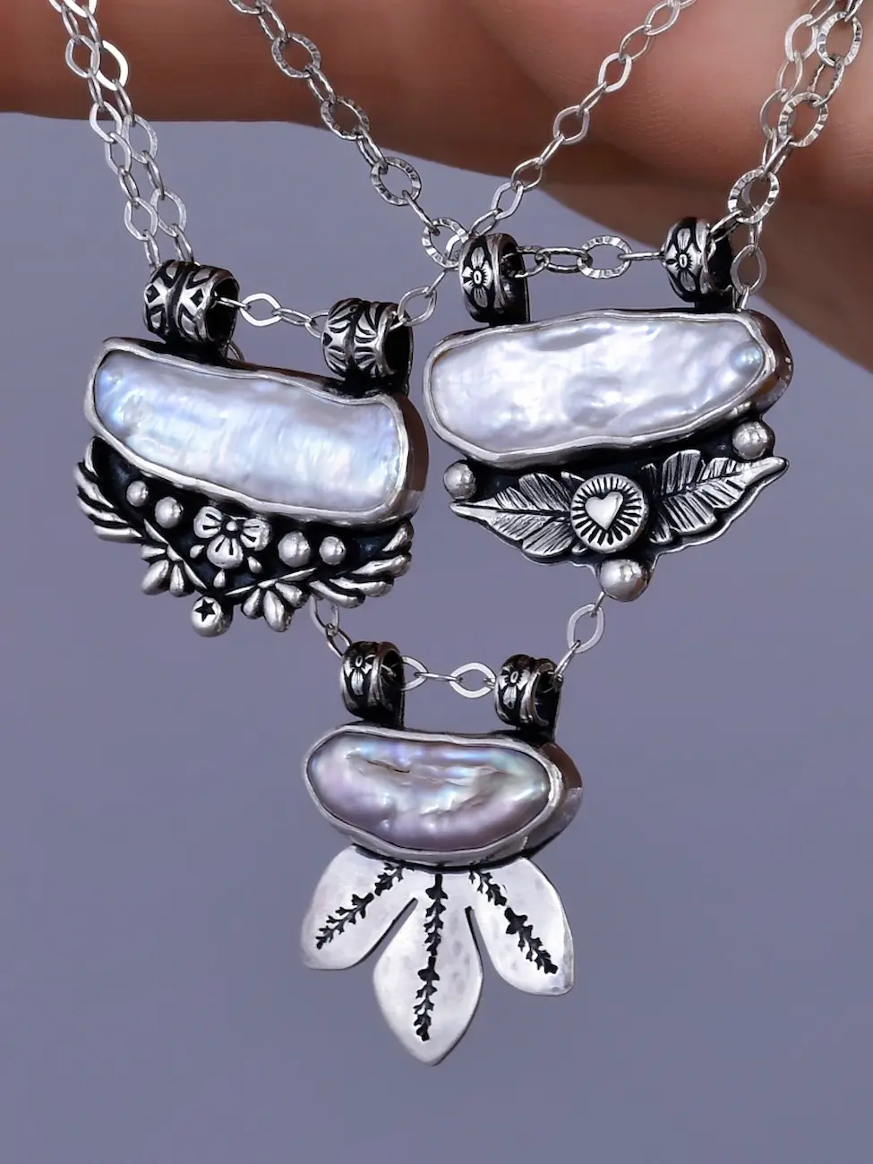 Handcrafted from sterling silver, this necklace features a natural Biwa Akoya pearl in an organic shape. Floral elements and textured bails give the piece a rich, ornamental character.