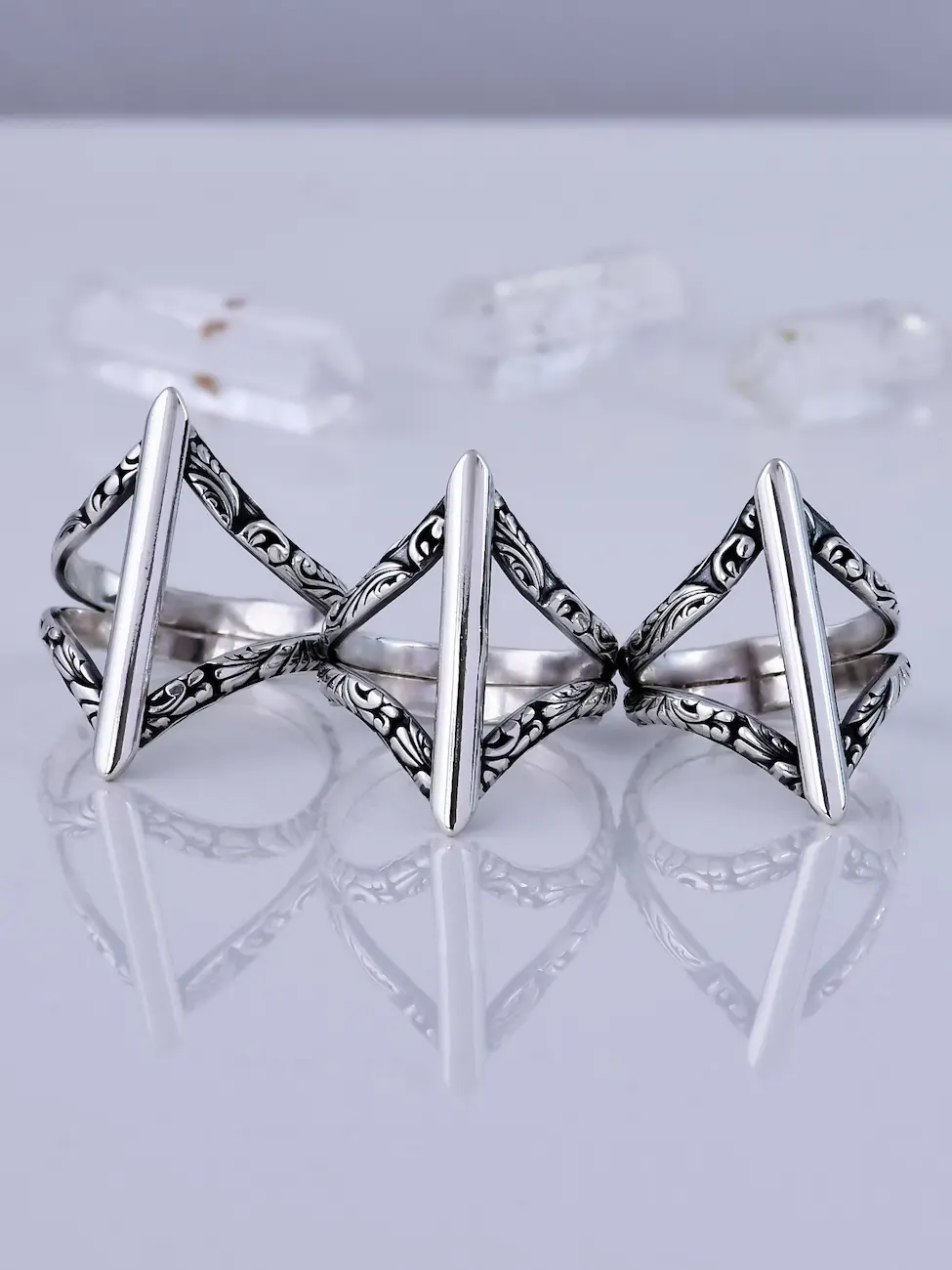 This handcrafted sterling silver ring features a floral-patterned band and a sleek silver bar made from half-round wire. Its clean, versatile design strikes a balance between elegance and casual style, making it perfect for any outfit.