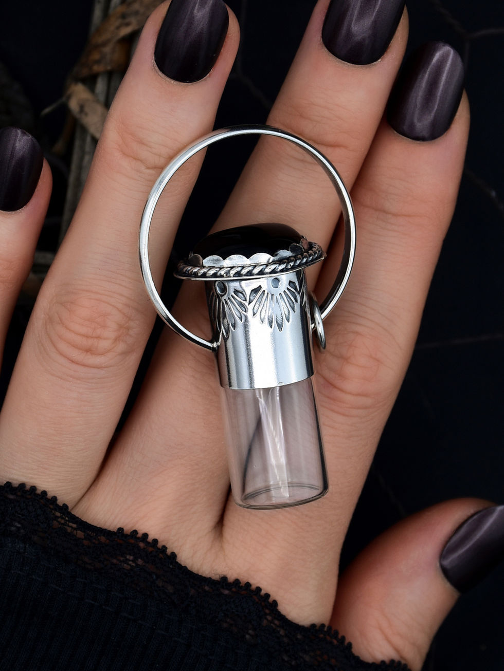This handmade sterling silver essential oil pendant features a heart-shaped black Onyx and hand-stamped details. It holds a small glass vial, so you can take your favorite essential oil with you — wherever you go. The pendant is sold without a chain and is attached with a simple jump ring, large enough to fit most cords or chains.