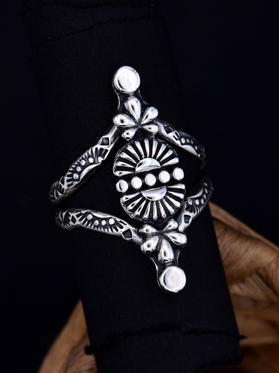 This delicate ring is made from 925 sterling silver, featuring split double bands and a detailed hand-stamped pattern. A sunrise design adorns the center, symbolizing growth, harmony and new beginnings. Each piece is carefully handcrafted by me. Its timeless silver tone makes it easy to style and perfect for any outfit, from casual to elegant.