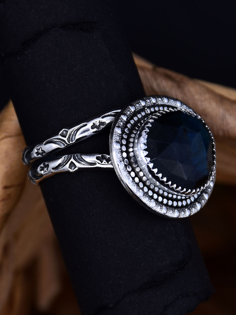 This handmade sterling silver ring features a deep blue Spectrolite from the Labradorite family, set in a serrated bezel. The stone is framed with a beaded wire and a patterned wire border that add rich texture and detail. A split band with hand-stamped designs completes this bold and intricately crafted piece.